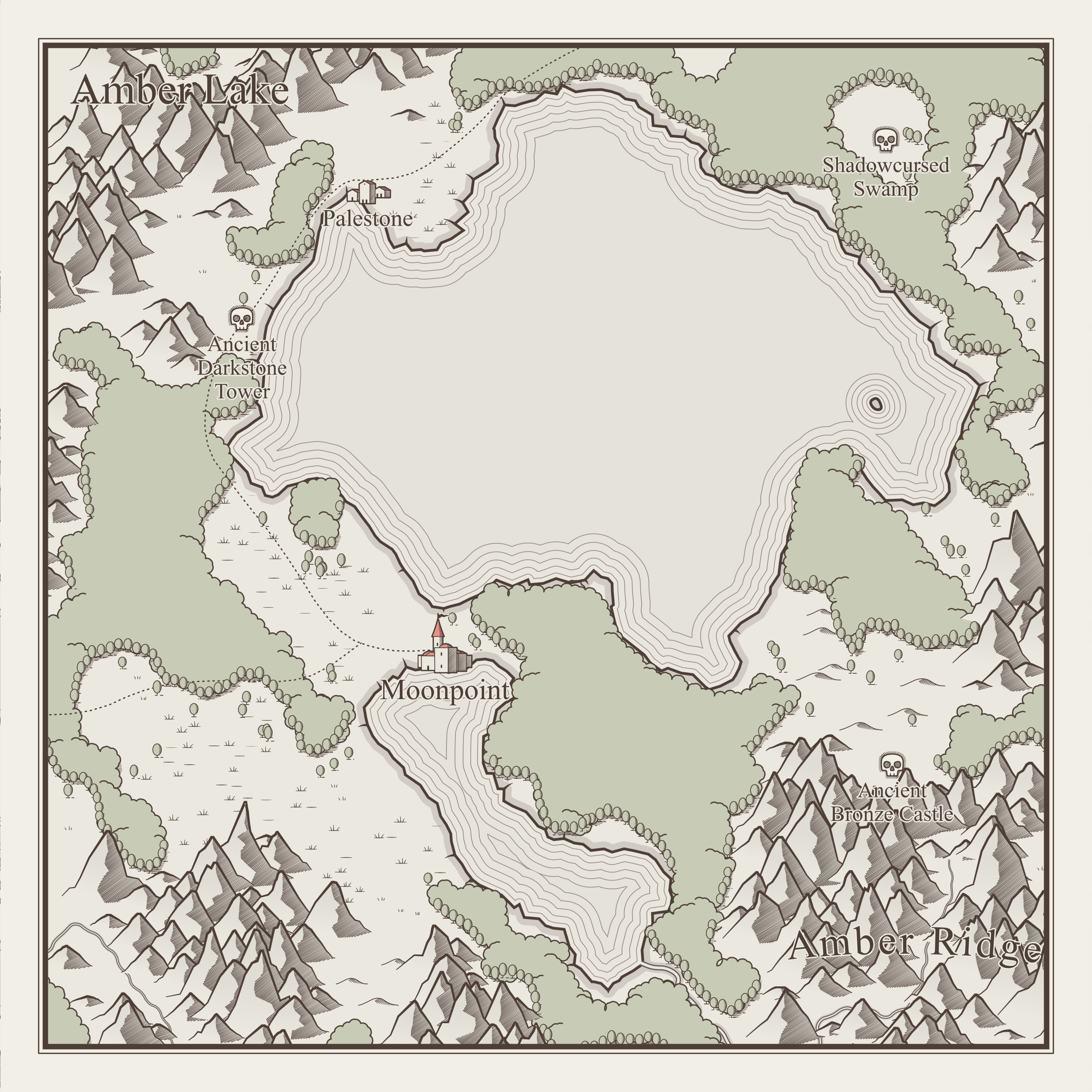 Amber Lake is the basin of the Amber River, which flows down through the mountains to the great city of Amber Falls. The mining town of Palestone is critical to the Mythril trade of Amber Falls. The Mythril is transported across the lake to the port city of Moonpoint, where it is then put on larger river vessels to traverse it's way down to Amber Falls.